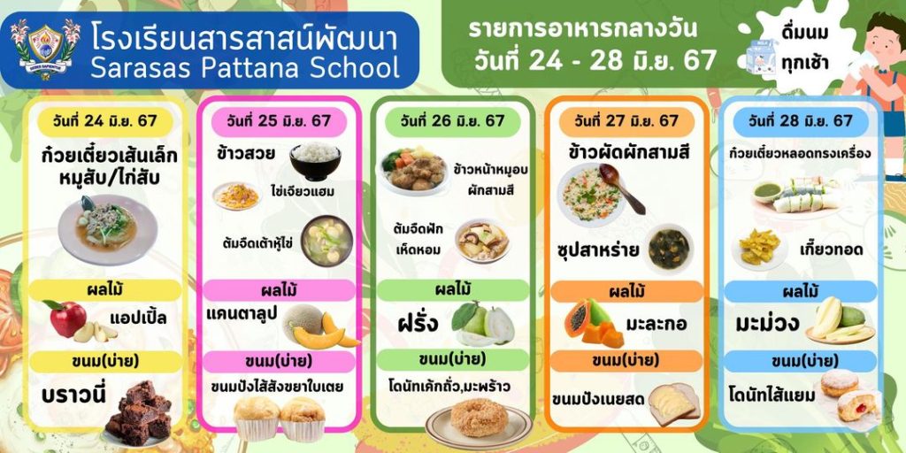 รายการอาหารกลางวันประจำวันที่ 24-28 มิถุนายน 2567