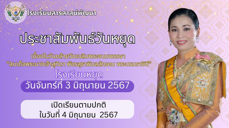 เนื่องในวันคล้ายวันเฉลิมพระชนมพรรษา “สมเด็จพระนางเจ้าสุทิดา พัชรสุธาพิมลลักษณ พระบรมราชินี” โรงเรียนหยุด ในวันที่ 3 มิถุนายน 2567 และเปิดเรียนตามปกติในวันที่ 4 มิถุนายน 2567 #โรงเรียนสารสาสน์พัฒนาSarasas Pattana School