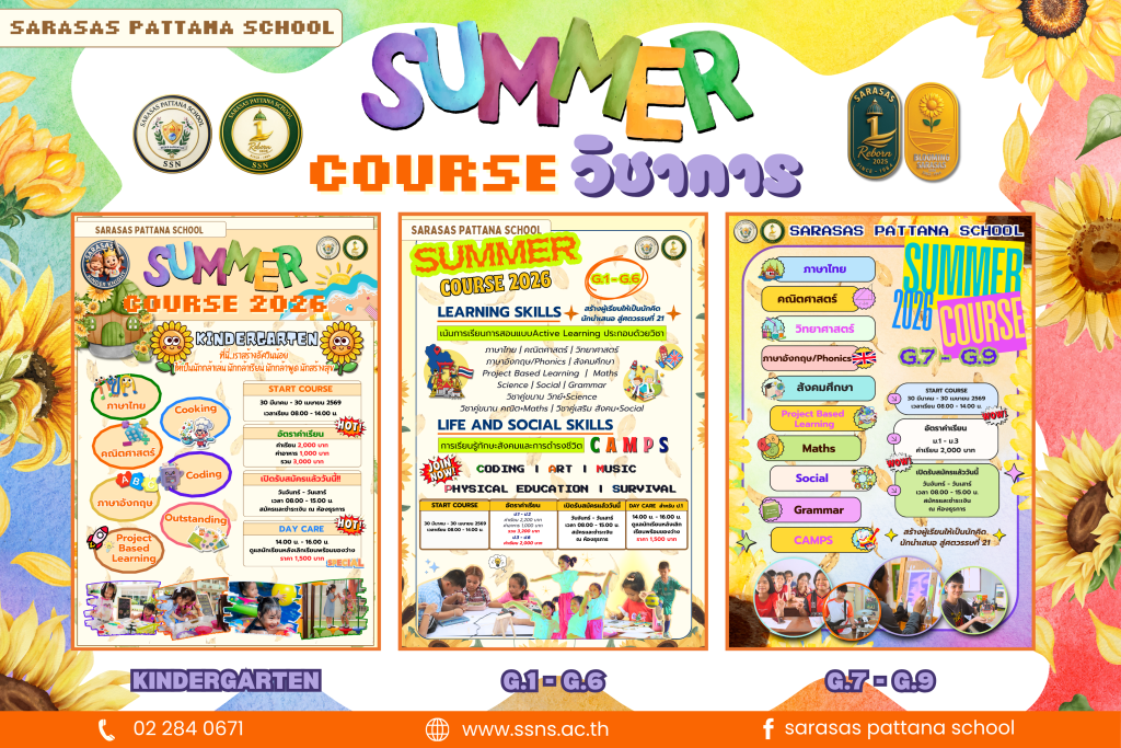 เติมเต็มทั้ง “วิชาการ” และ “วิชาพิเศษ” อย่างลงตัว พัฒนาความรู้ เสริมทักษะ สร้างความมั่นใจ ทั้งในห้องเรียนและนอกห้องเรียน ซัมเมอร์นี้ไม่ใช่แค่เรียนเพิ่ม แต่คือการเติบโตอย่างรอบด้าน พร้อมก้าวสู่ปีการศึกษาใหม่อย่างมั่นใจ Start Course 30 มีนาคม 2569 – 30 เมษายน 2569 สมัครและชำระเงินหรือติดต่อสอบถามเพิ่มเติมได้ที่ ห้องธุรการ โทร 02 284 0671 #Sarasas #Sarasaspattana #Sarasaspattanaschool