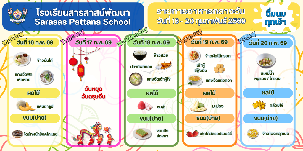 ประจำวันที่ 16 – 20 กุมภาพันธ์ 2569 #Sarasas #Sarasaspattana #Sarasaspattanaschool #SarasasArea1