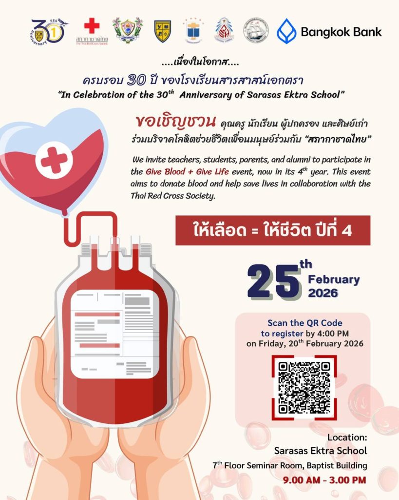 เนื่องในโอกาสครบรอบ 30 ปี ของโรงเรียนสารสาสน์เอกตรา ขอเชิญชวน คุณครู , นักเรียนที่มีอายุ 17 ปีขึ้นไป ท่านผู้ปกครอง, ศิษย์เก่า และผู้ที่สนใจ ร่วมบริจาคโลหิตช่วยชีวิตเพื่อนมนุษย์ร่วมกับสภากาชาดไทย ในกิจกรรม “ให้เลือด = ให้ชีวิต” ปีที่ 4 กำหนดวันเข้ารับบริจาคโลหิต วันพุธที่ 25 กุมภาพันธ์ 2569 ณ ห้องสัมมนา ชั้น 7 อาคาร
